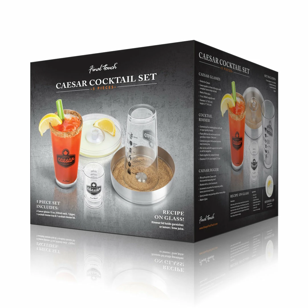 Serve up the ultimate Caesar with this all in one set. Easily rim each glass in the included rimming tray with lid that doubles as a lemon / lime juice tray. Then just add ice & ingredients to each of the 4 included glasses. Don’t know the recipe? No problem. Just follow the recipe printed directly on the back of each glass.