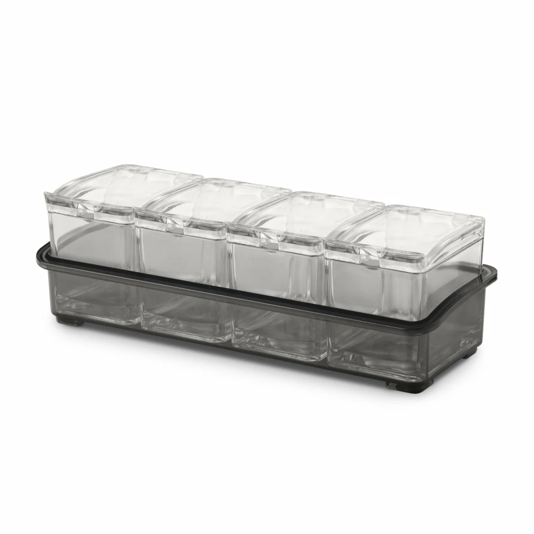 Keep your garnishes for crafty cocktails organized and sanitary with this four tray garnish bar caddy. Each container holds up to 6oz (200 ml) of cherries, olives, lemons or limes and the built-in lids on each container help keep everything fresh and clean. Simply remove each container from the base for easy cleaning when finished.