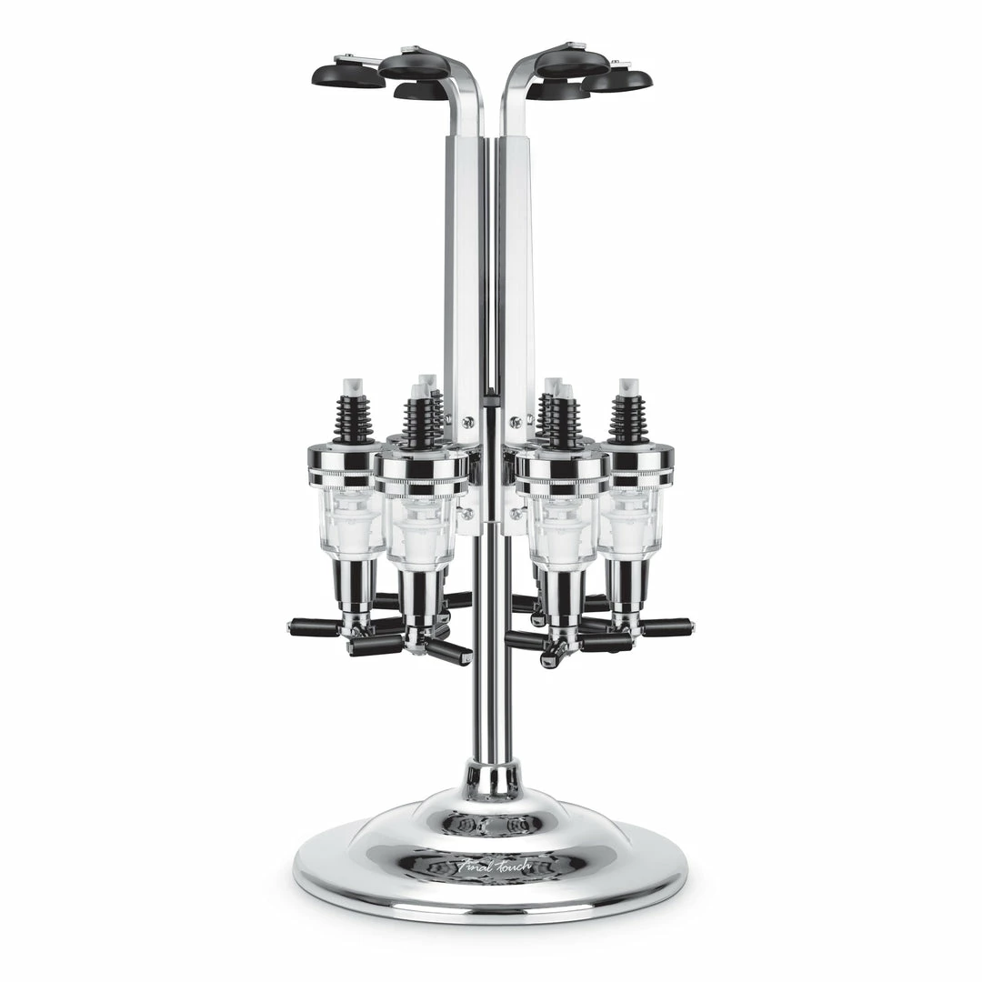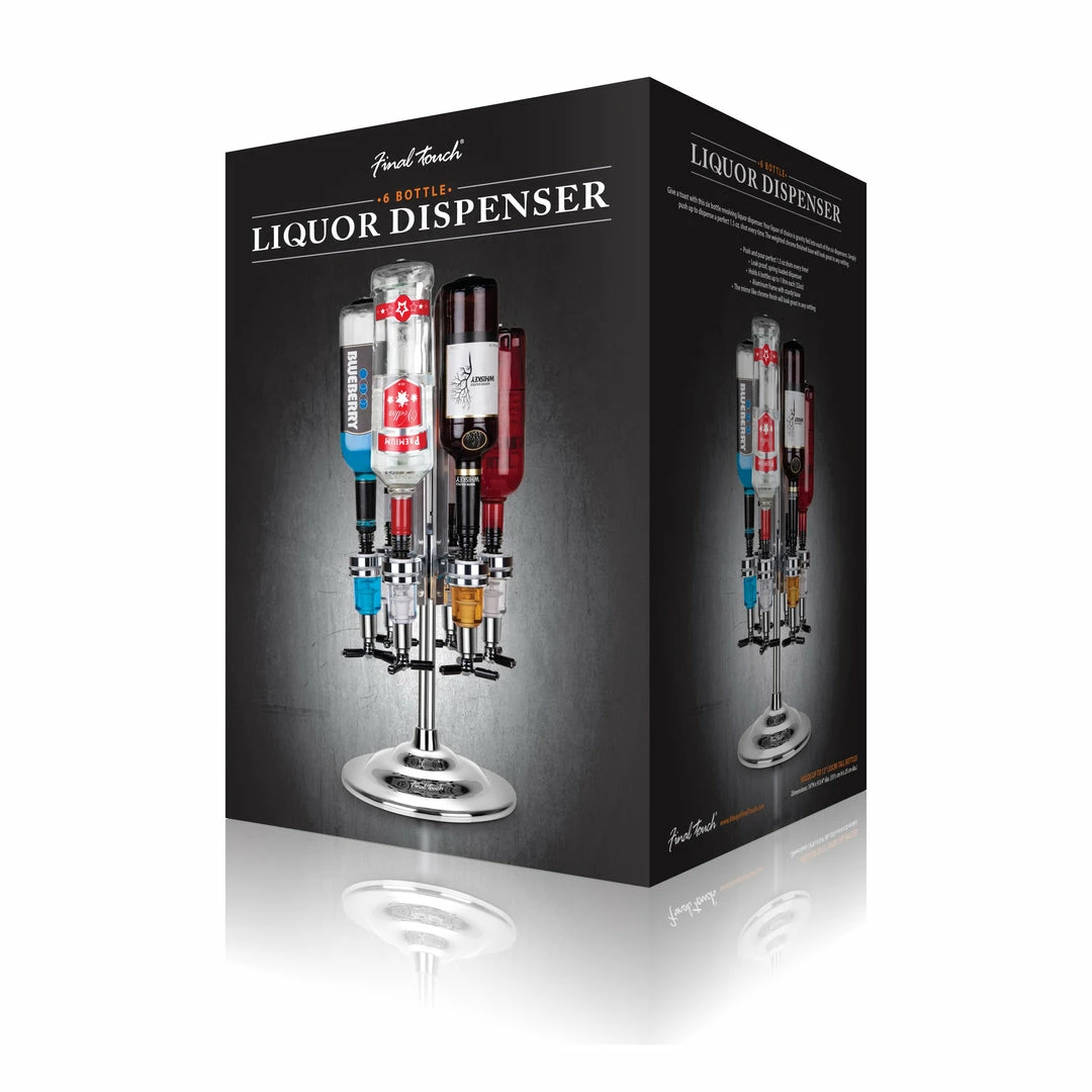 Give a toast with this six bottle revolving liquor dispenser. Your liquor of choice is gravity fed into each of the six dispensers. Simply push up to dispense a perfect 1.5 oz. shot every time. The weighted chrome finished base will look great in any setting.