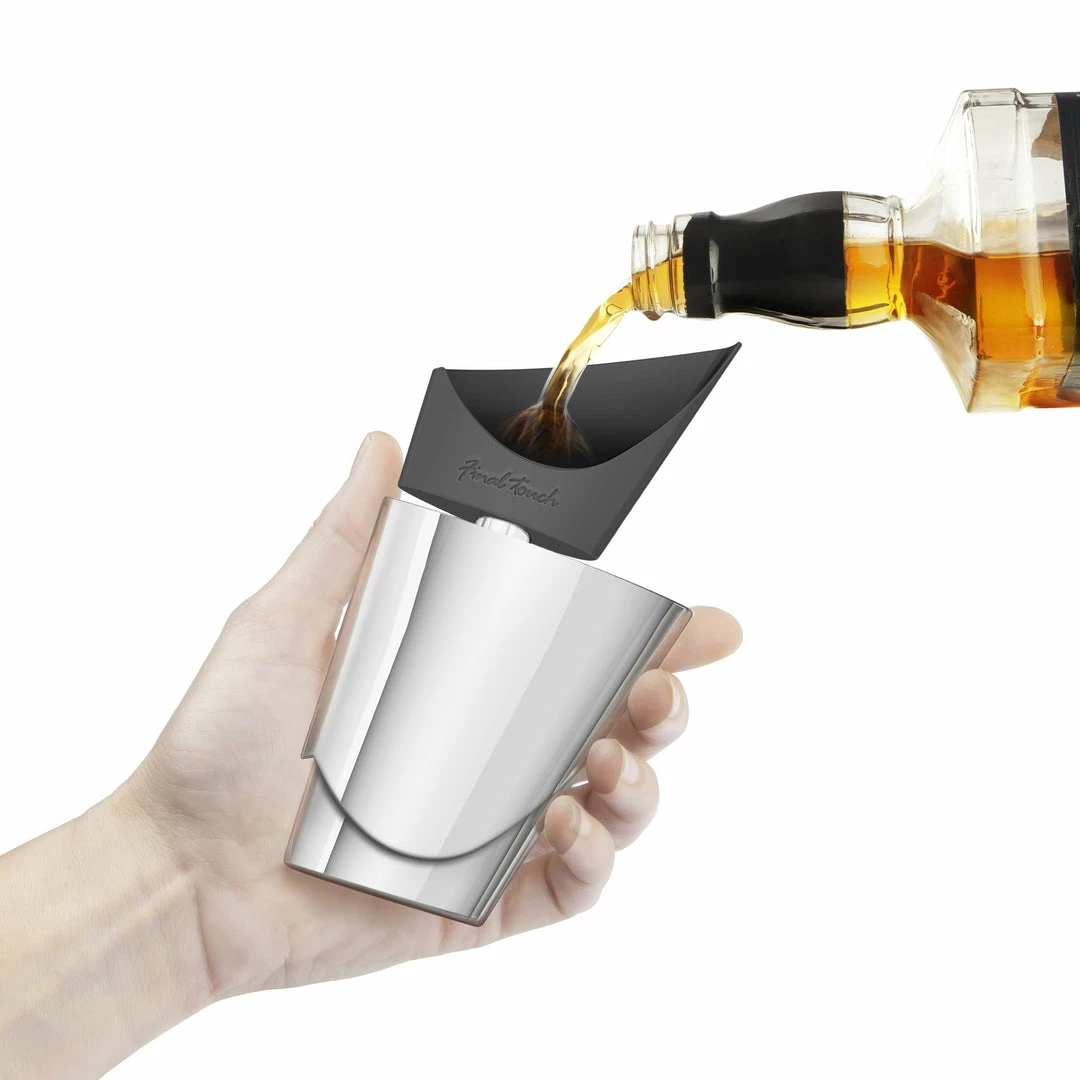 Simply slide off the nested silicone funnel from the bottom of the flask, then remove cap and place funnel on top to fill without any mess.