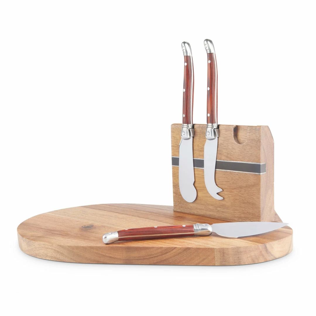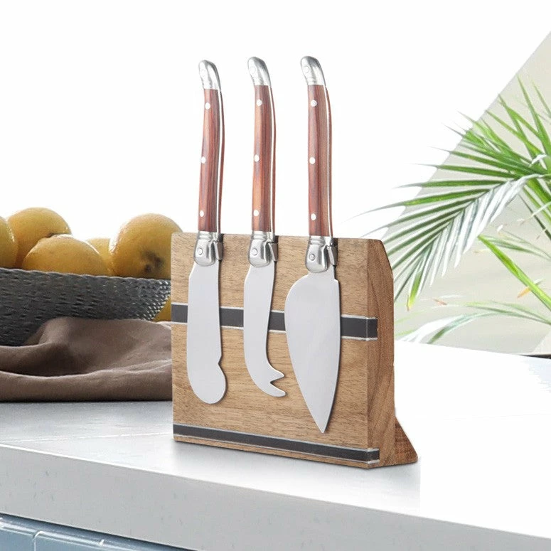Slice & serve in style with this magnetic cheese board set. The removable magnetic cheese knife block helps keep the knives neatly organized and protected while in use or stored away in a drawer.