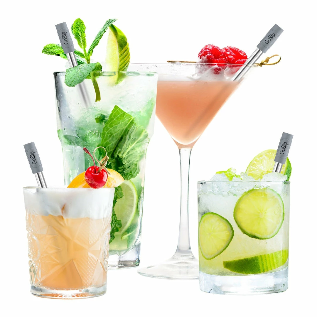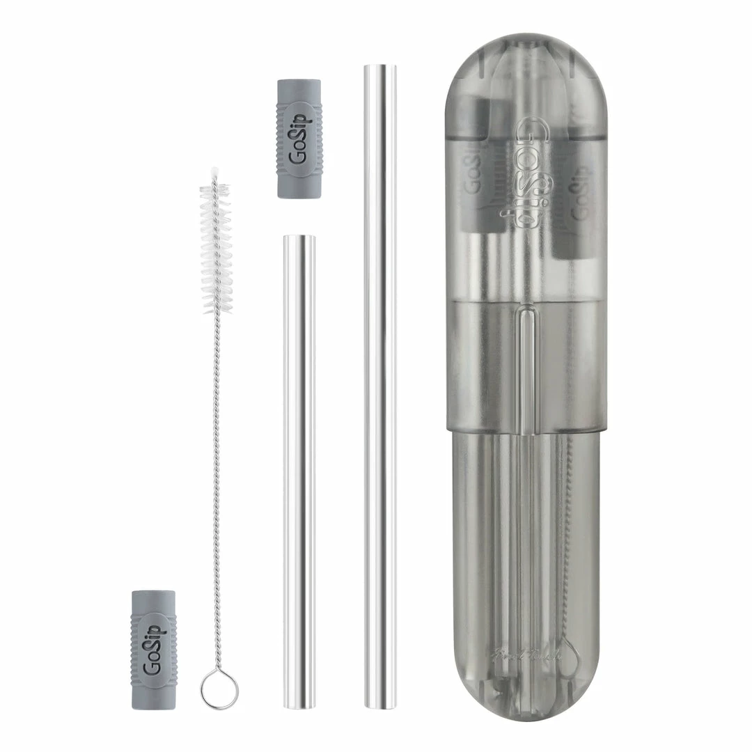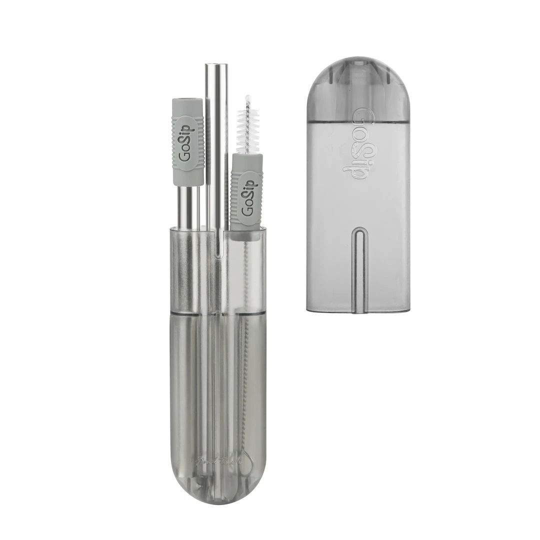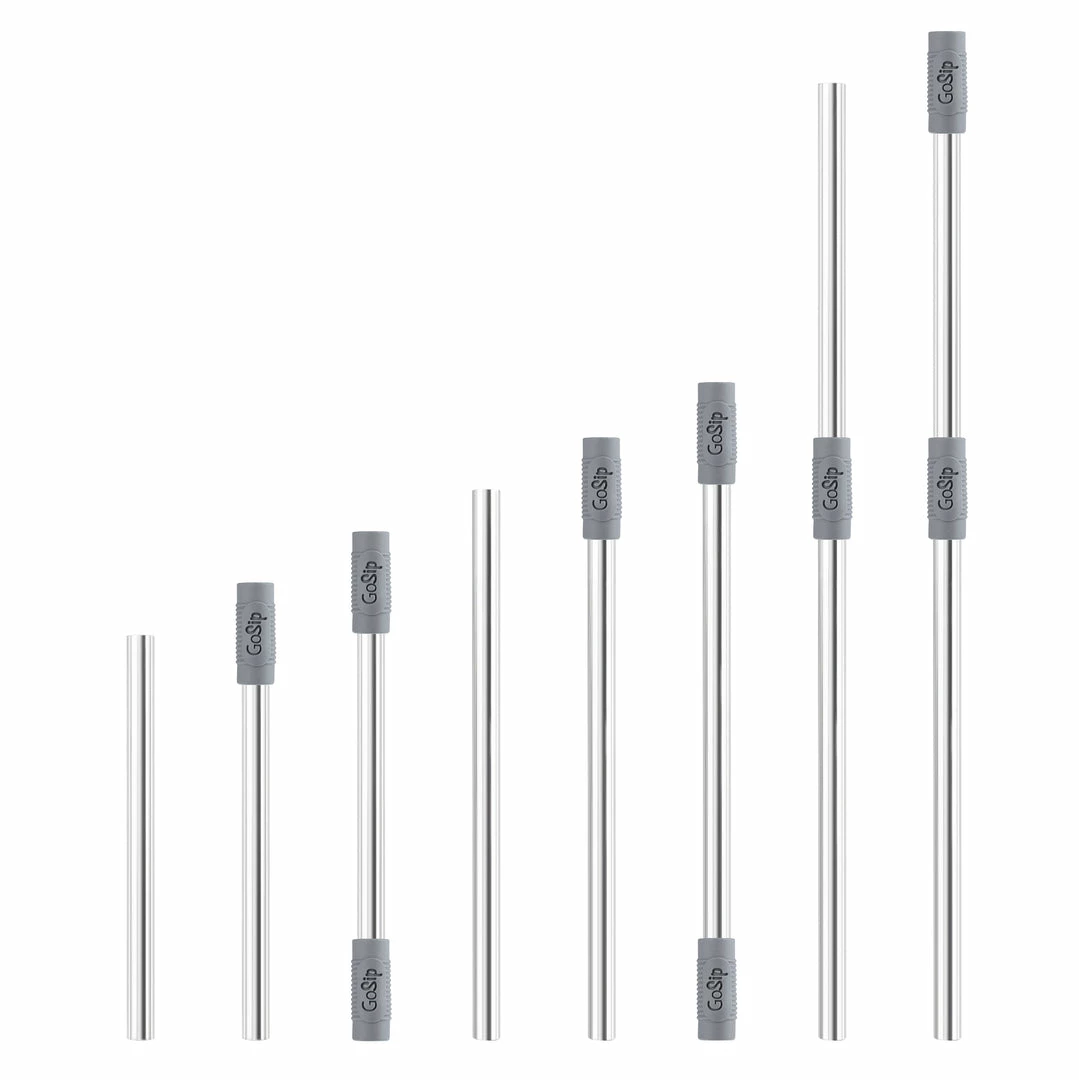 Adjustable from 4.5 and 6 inch lengths, to 10.5 inches, GoSipTM is a versatile reusable straw ideal for bars, restaurants, travel or workplace. The two included silicone connectors can be used to connect the straws and as a soft sip tip that is comfortable on teeth and lips. For on-the-go use, simply clean with the included brush and insert into the vented compact case that easily slips into any pocket, jacket or purse.