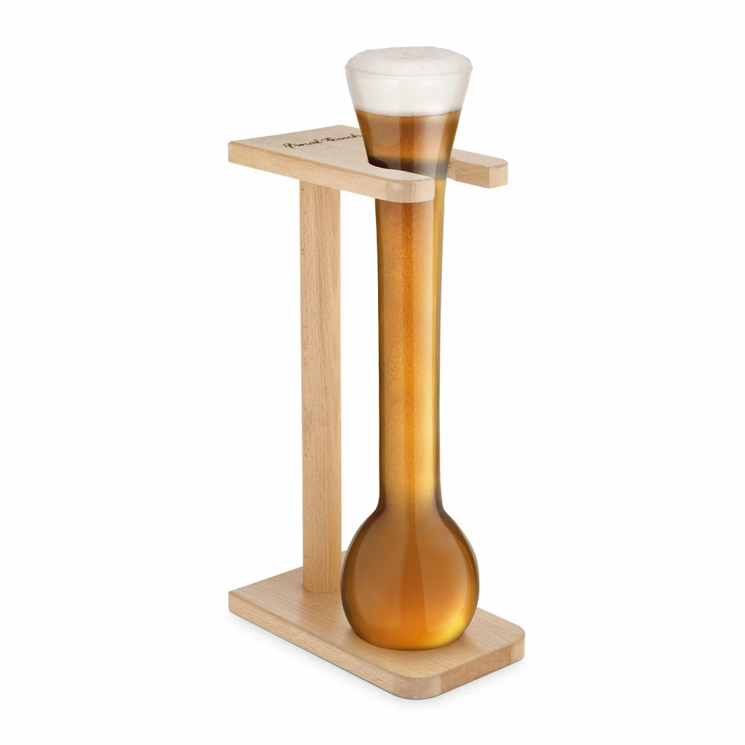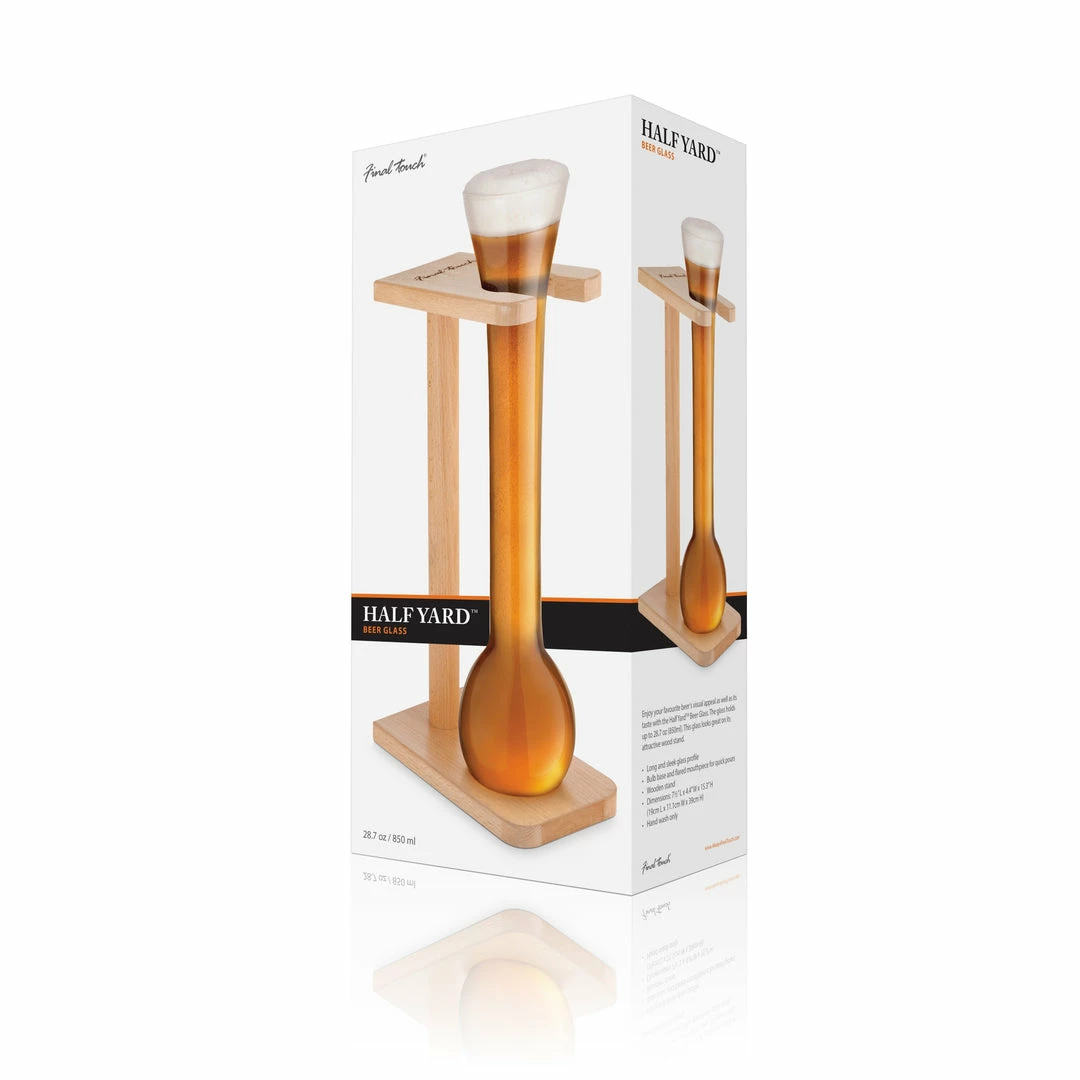 Also known as the long glass or Cambridge yard this half yard beer glass features a long shaft and shaped with a bulb at the bottom for smooth drinking. The included oak stand helps to keep the glass standing safely and securely upright. This glass holds up to 28.7 oz (850 ml) of your favourite brew.