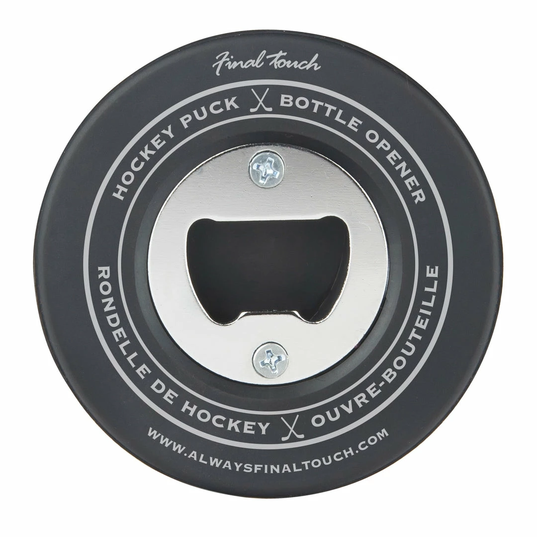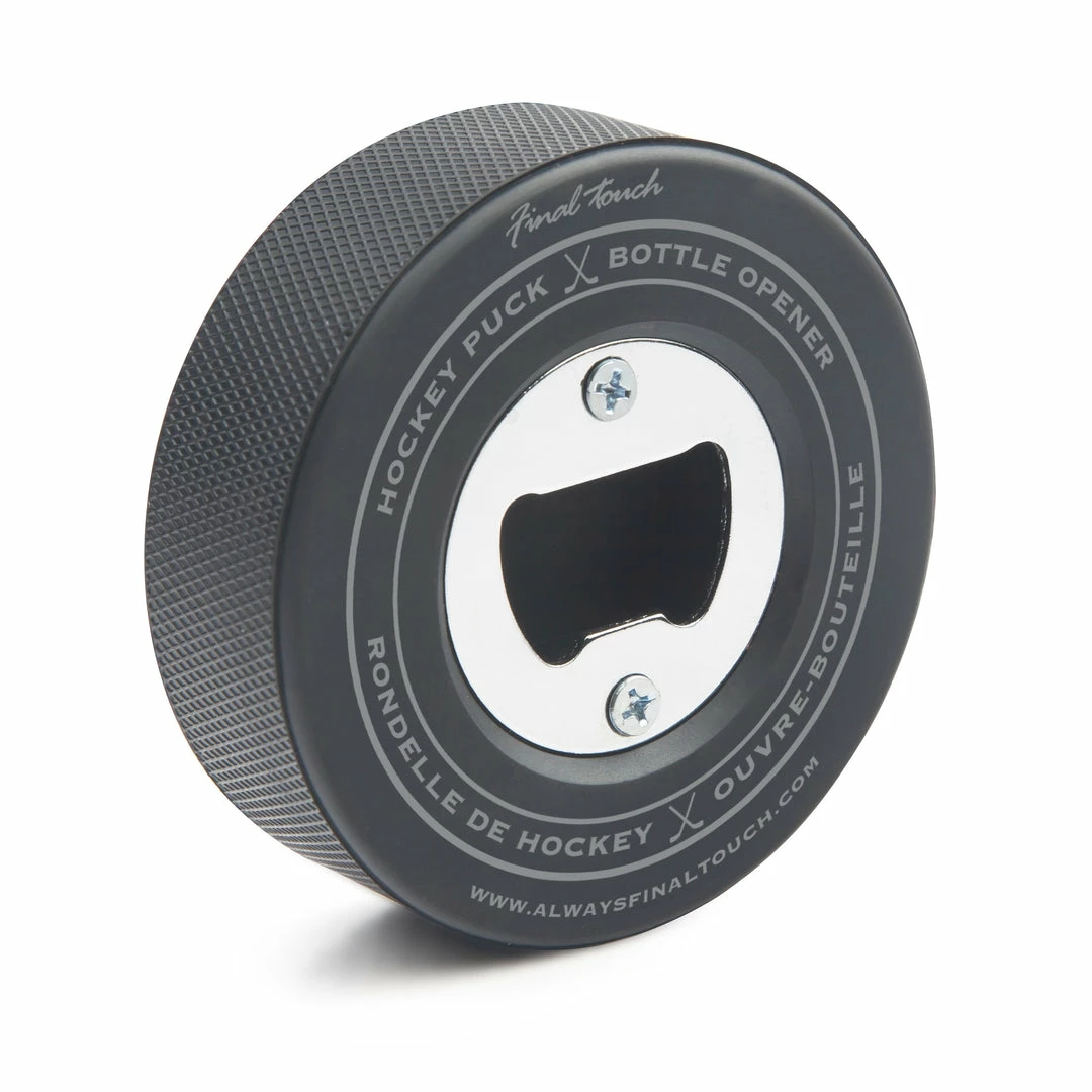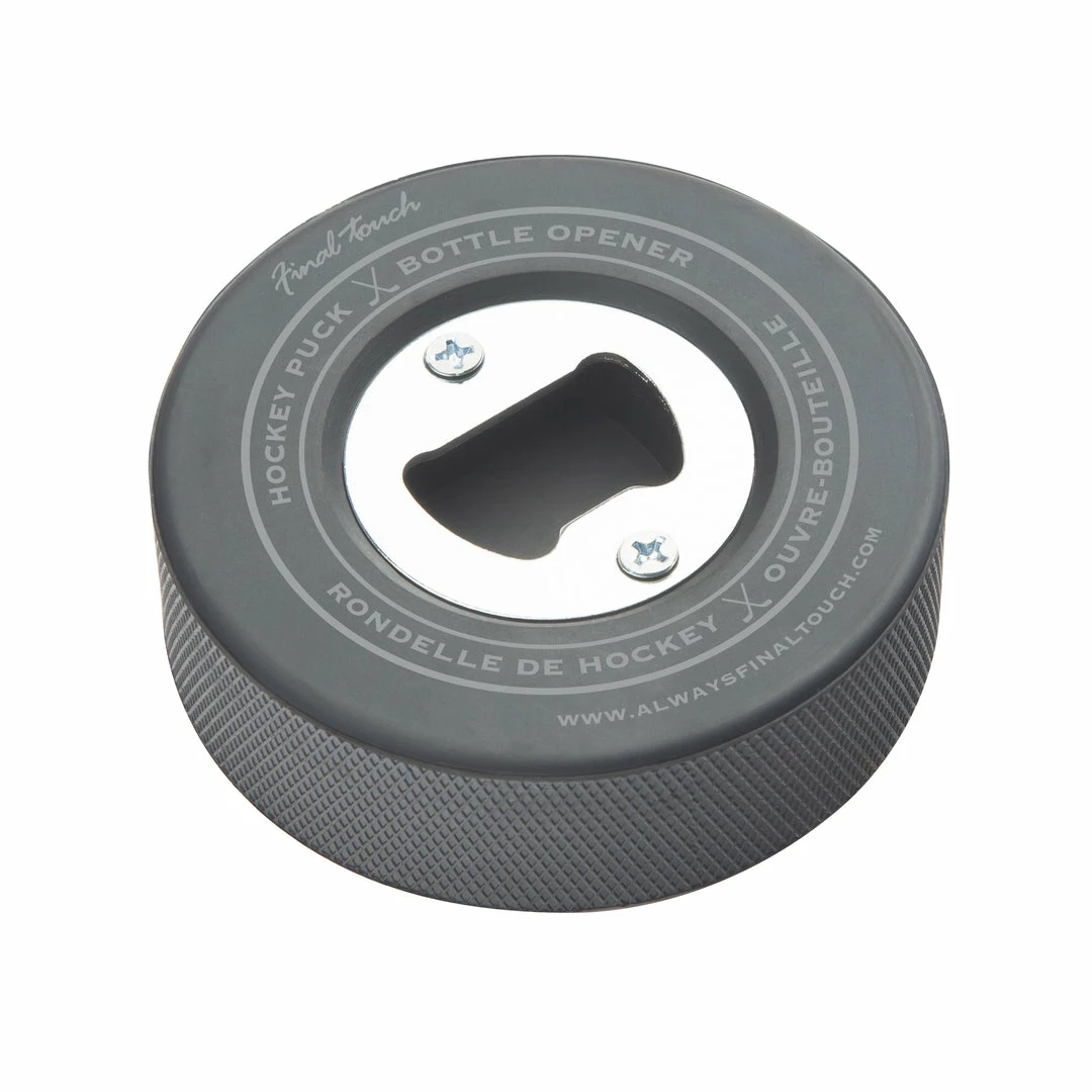 Made from real hockey pucks! Pop open your favourite drink before the game with this opener made from a rubber hockey puck! The puck opener fits comfortably in your hand to remove stubborn caps with ease because it is the actual, playable size.