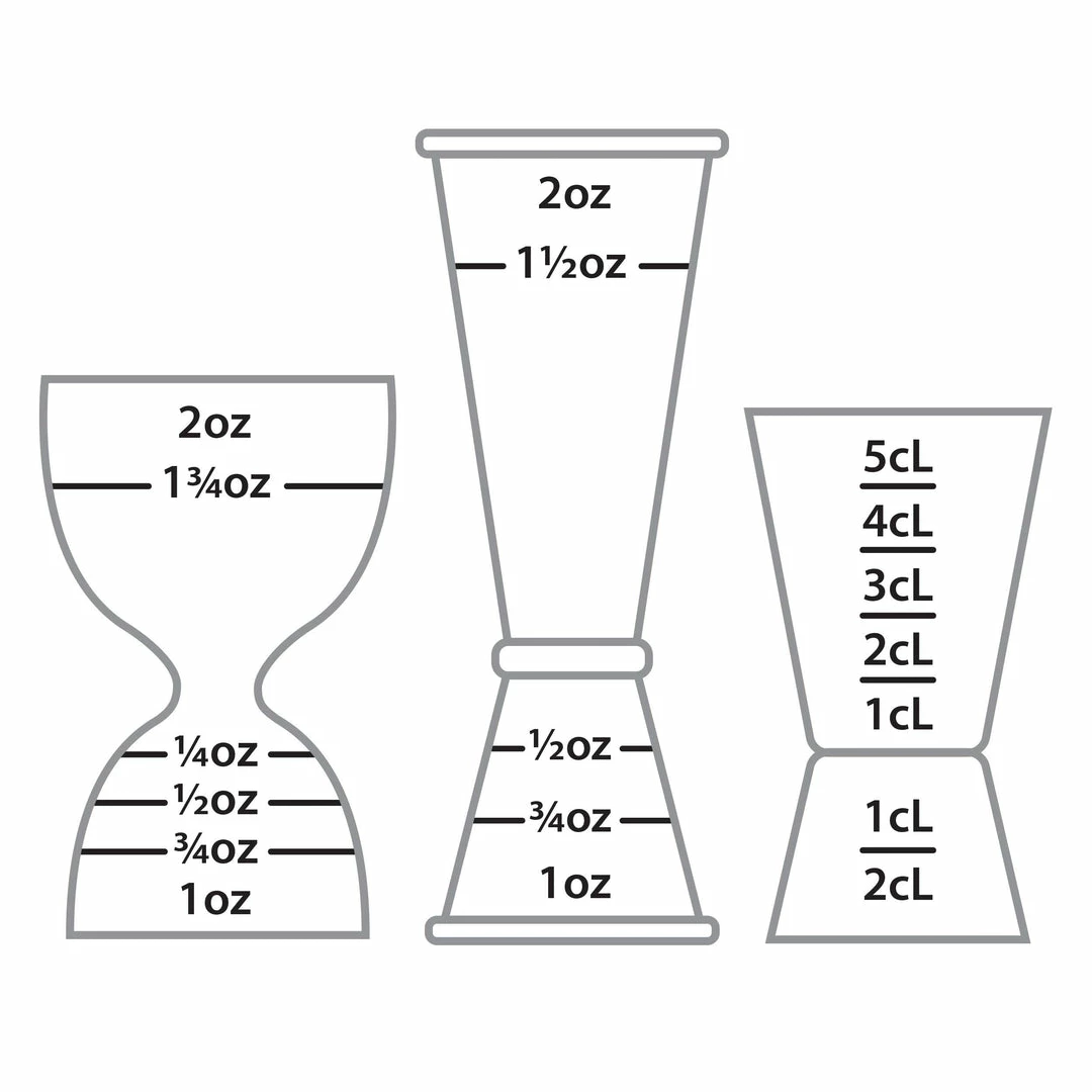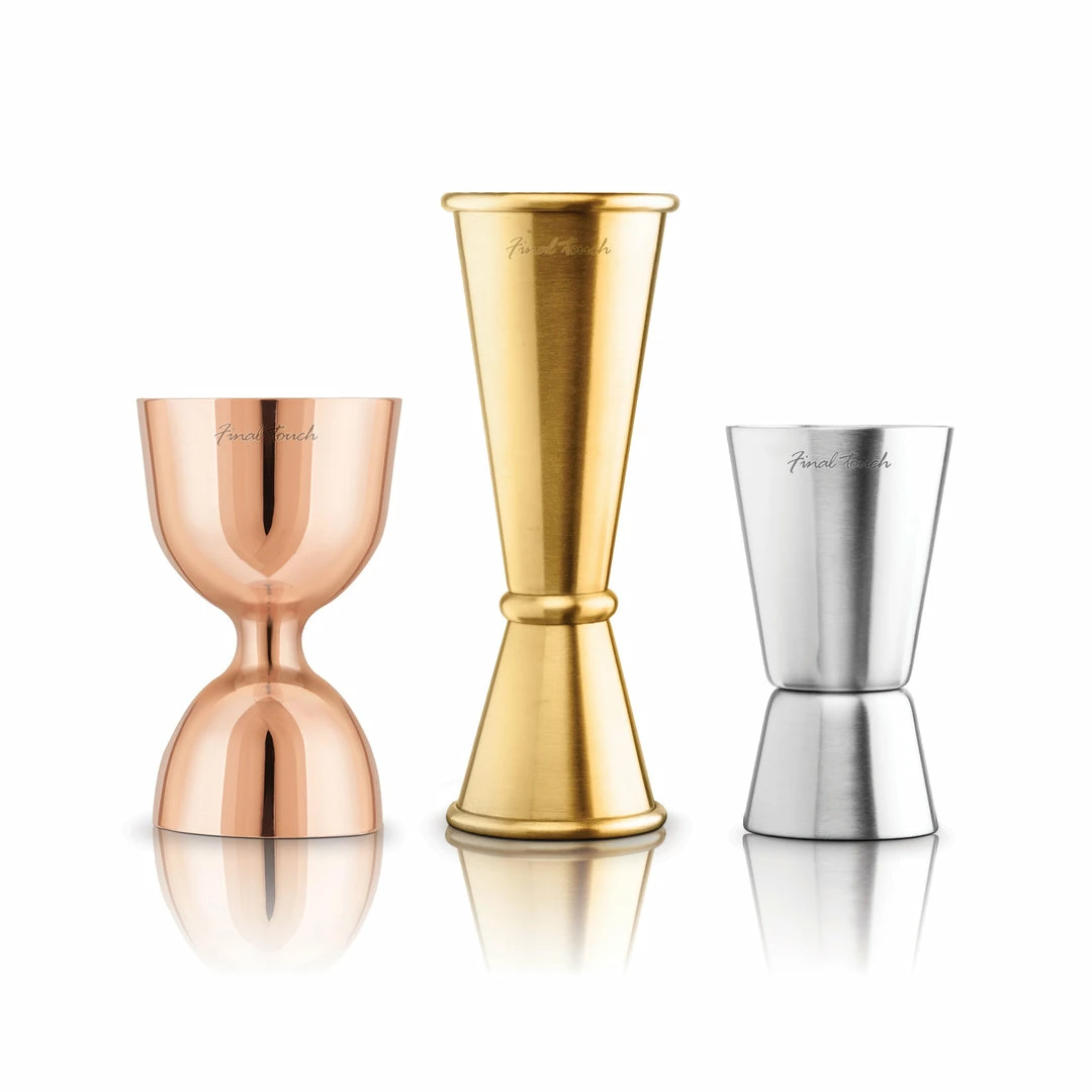 - Includes three stainless steel jiggers in different finishes; copper, brass & stainless steel