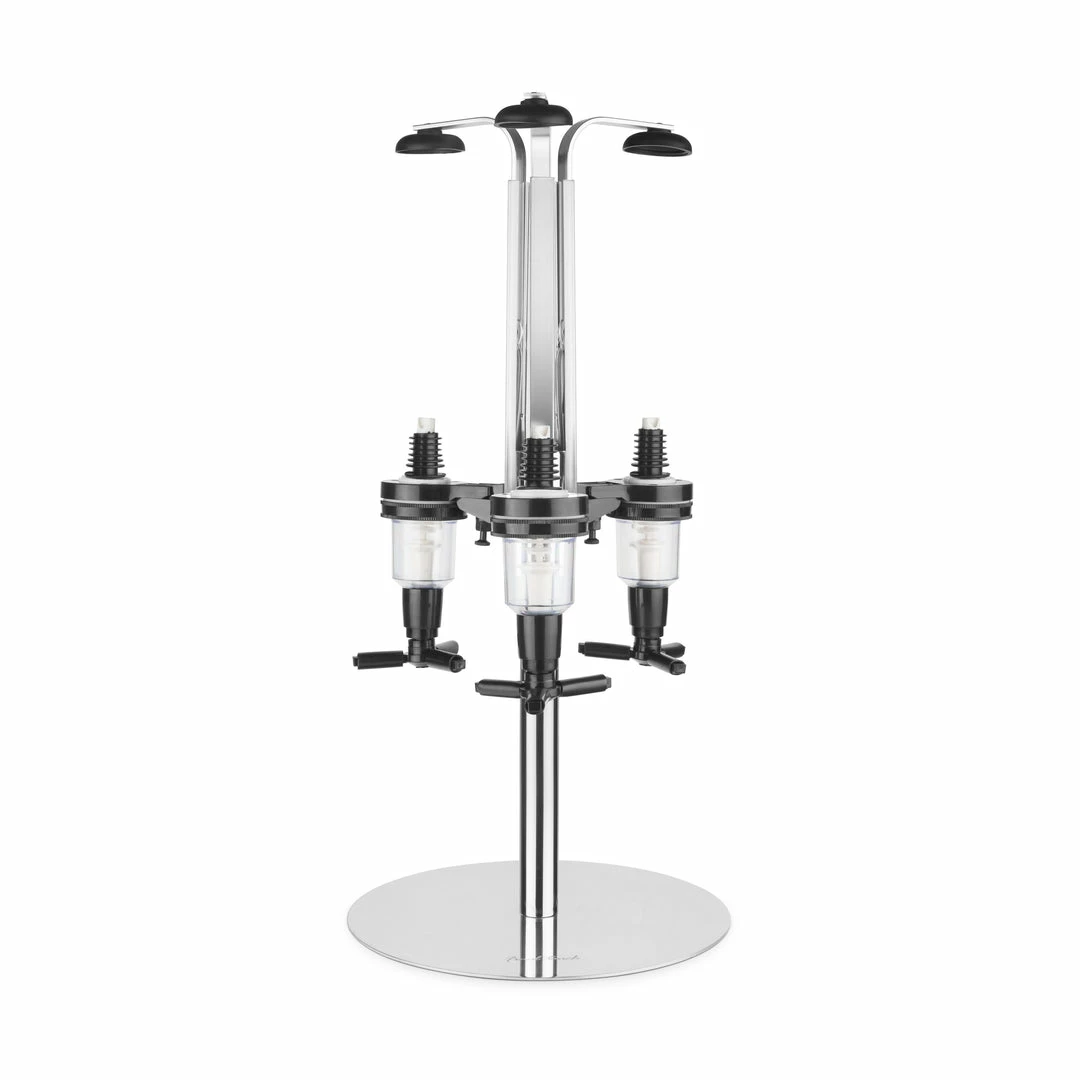 Give a toast with this three bottle revolving liquor dispenser. Your liquor of choice is gravity fed into each of the three dispensers. Simply push up to dispense a perfect 1.5 oz. shot every time. The weighted chrome finished base will look great in any setting.