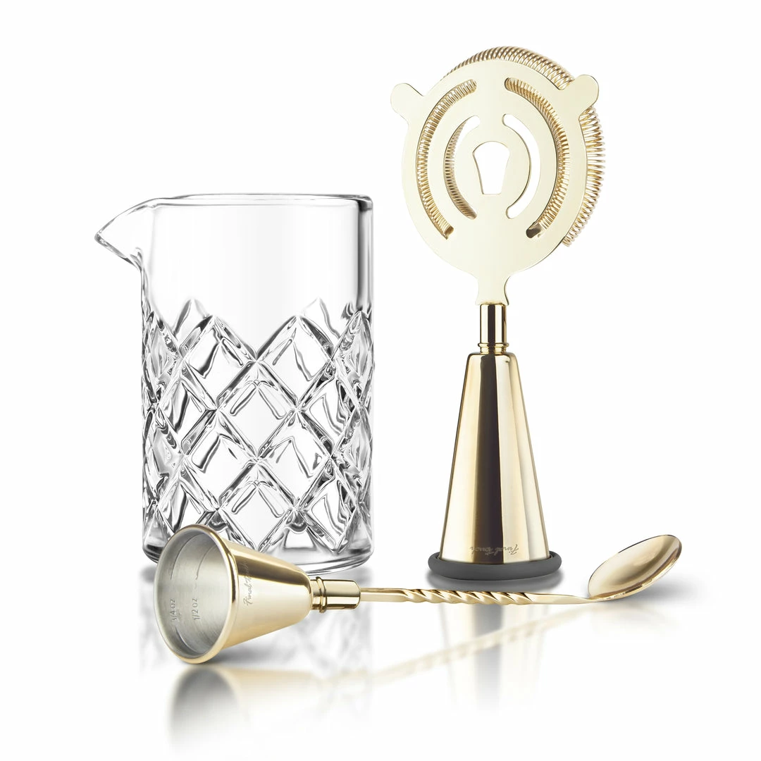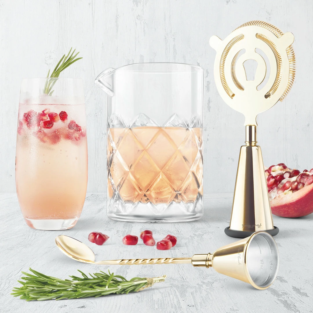 This multi-function cocktail mixing set includes the essential tools for pouring, stirring and straining the perfect cocktail. Both the strainer and spoon feature built-in jiggers for quick and easy measurements from 1 to 2 oz.