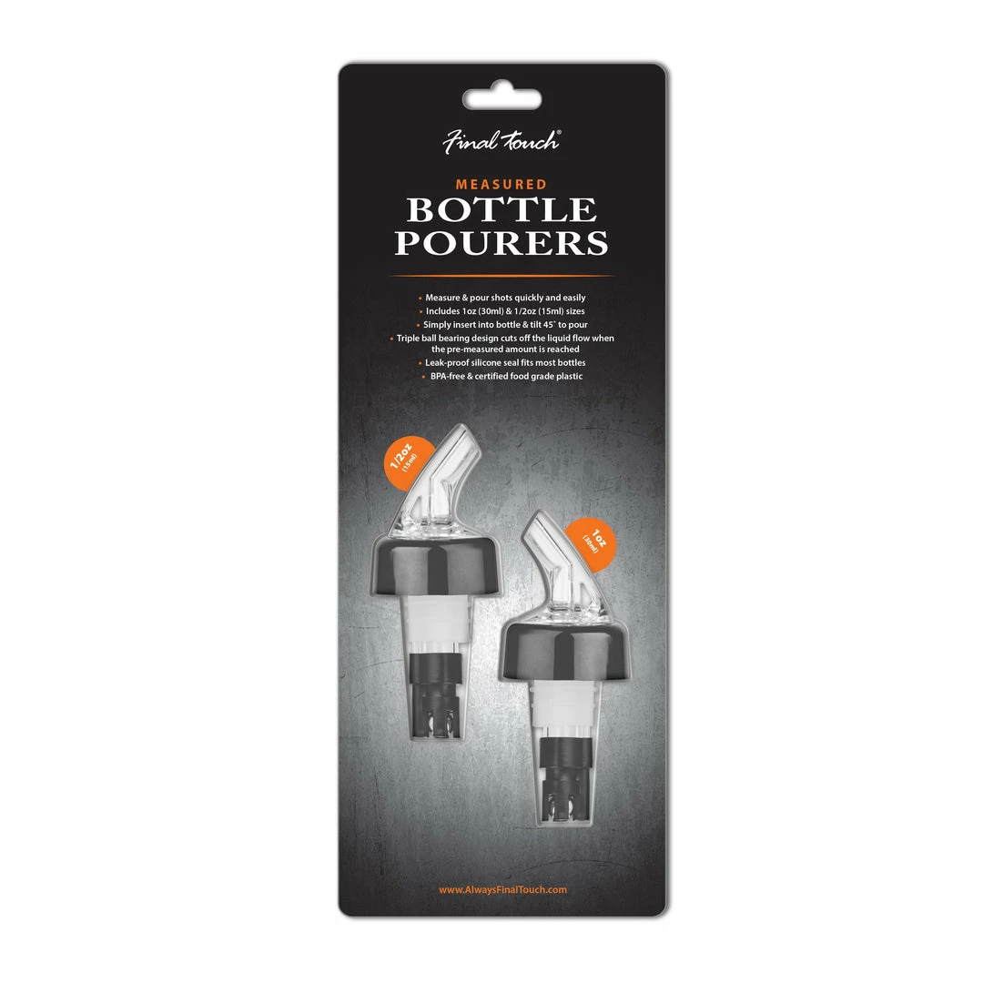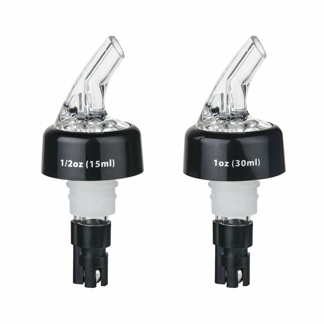 Add each of these pourers to the bottles in your bar for easy and effortless measuring. This set includes two convenient 1 & ยฝ ounce sizes that make following recipes simple. All you have to do is insert into the bottle and tilt 45 degrees to pour. The triple ball bearing design cuts off the liquid flow when the pre-measured amount is reached and the leak-proof silicone seal fits most bottles.