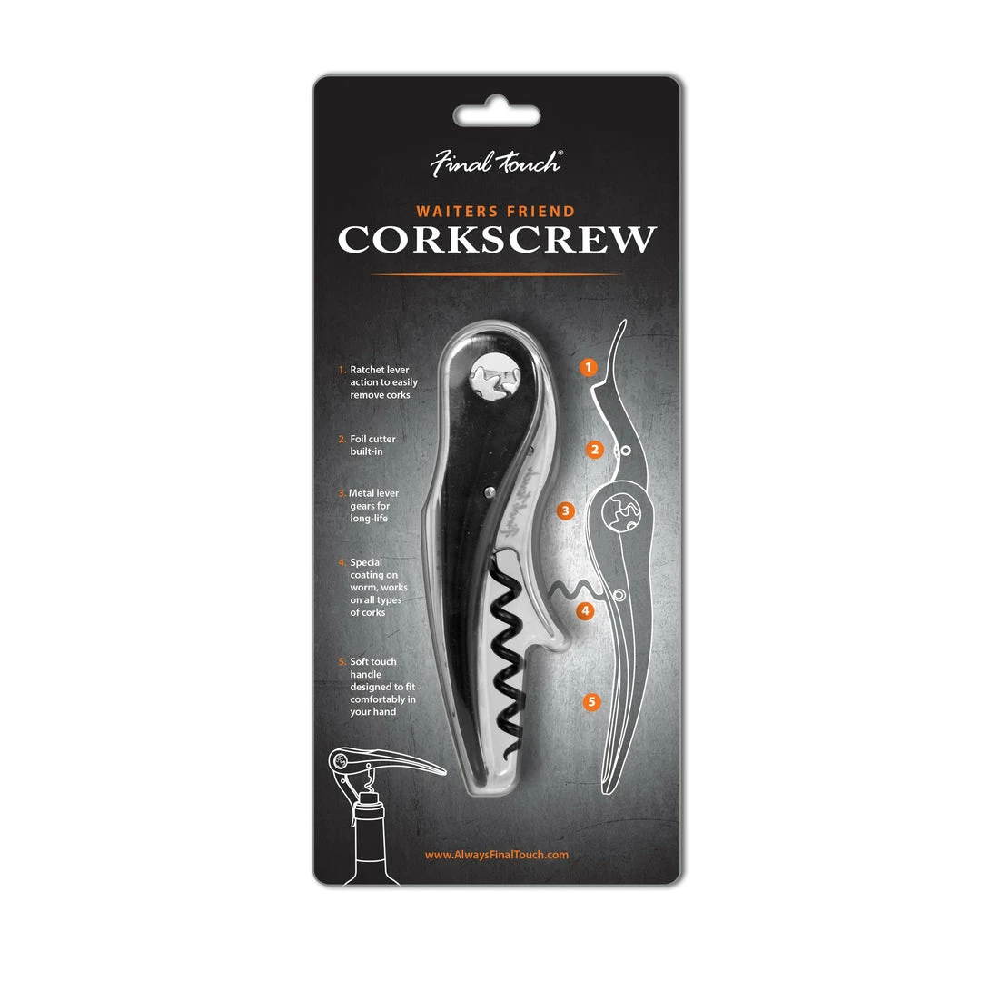 So simple and compact its the perfect tool for uncorking bottles. Special coating on the worm allows this corkscrew to work with all types of corks including; natural, plastic & synthetic corks. The built-in ratchet lever makes it easy to remove corks in one simple pull. With metal ratchet gears inside the lever this corkscrew is built to last. Ergonomically designed handle is soft to the touch and fits comfortably inside your hand. Also includes built-in foil cutter on the lever.