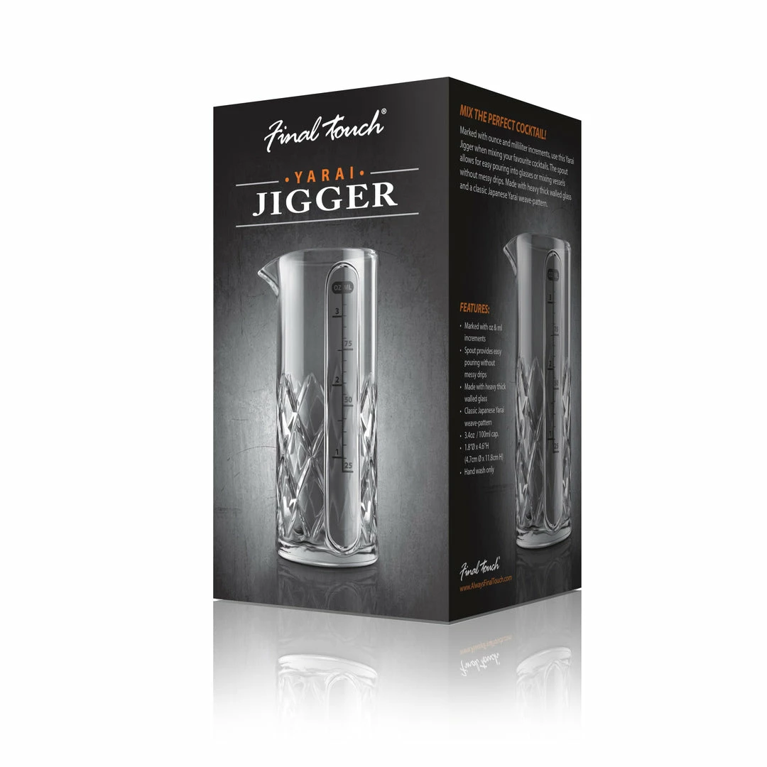 Mix the perfect cocktail! Marked with ounce and milliliter increments, use this Yarai Jigger when mixing your favourite cocktails. The spout allows for easy pouring into glasses or mixing vessels without messy drips. Made with heavy thick walled glass and a classic Japanese Yarai weave-pattern.