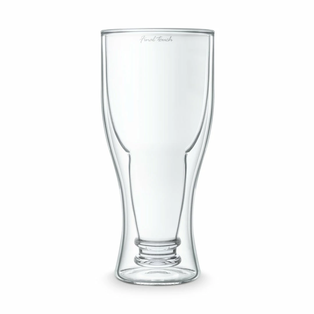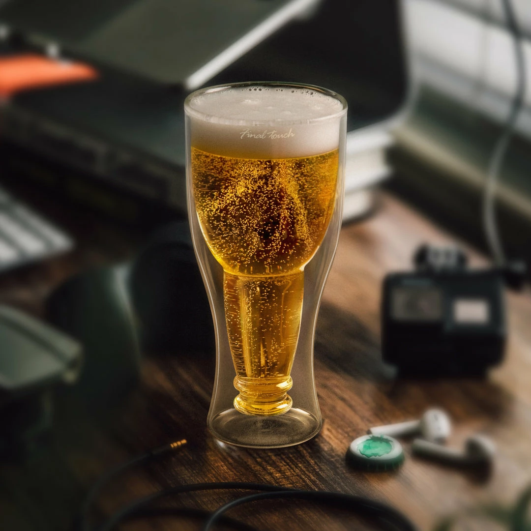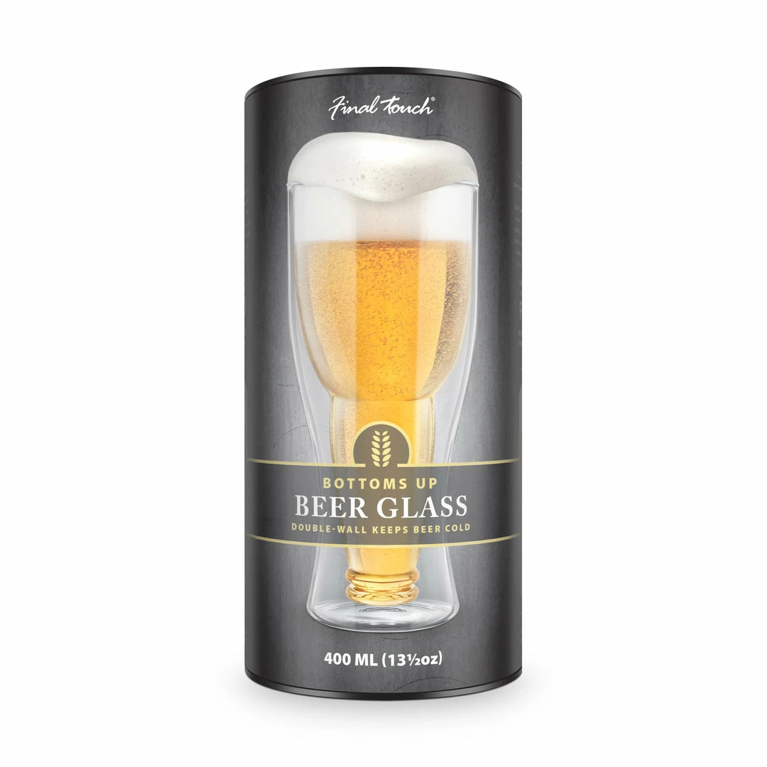 Our Bottoms Up Beer Glass is the stylish way to drink your beer. This beer glass is made of handblown durable borosilicate glass and crafted to perfection. Designed with double wall glass so your warm hands will not take the chill off your beer. Go and enjoy a cold one with our Bottoms Up Beer Glass.
